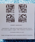 Ingredients: 64% Dark Chocolate (cacao beans, raw cane sugar, sugar, cocoa butter, sunflower lecithin), hazelnuts, sugar, milk powder, feuilletine (wheat flour, sugar, butter, milk powder, malt, salt), cocoa butter.