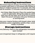 Enjoy our fondue as a quick snack, a starter, or as a delicious side dish for your next gathering. Simply reheat the bag in hot water or microwave the contents, then pour into your fondue pot or a serving bowl.
